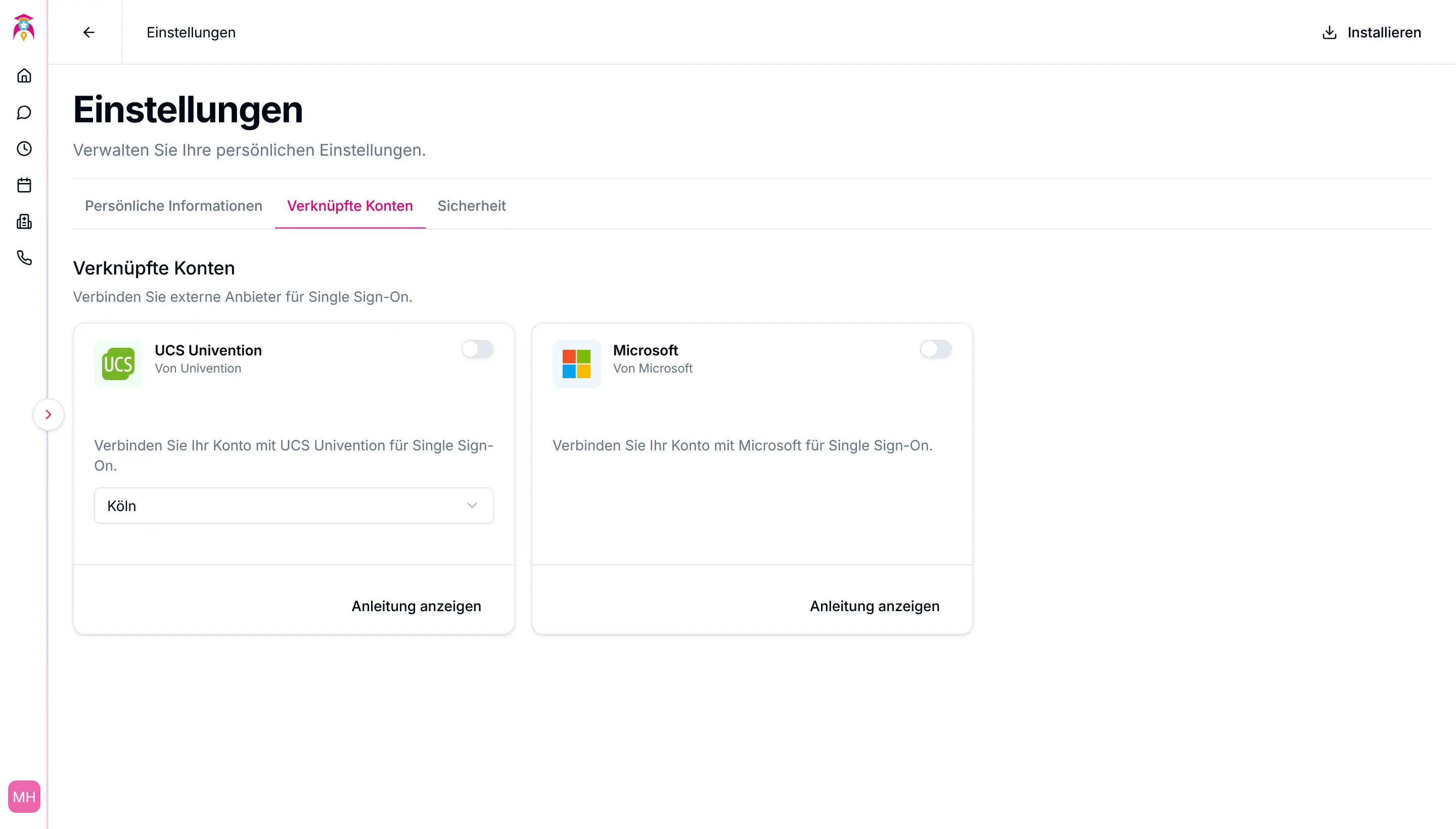 Hier können Sie Ihr Elternkonto mit einem USC- und einem Microsoft-Konto verknüpfen.