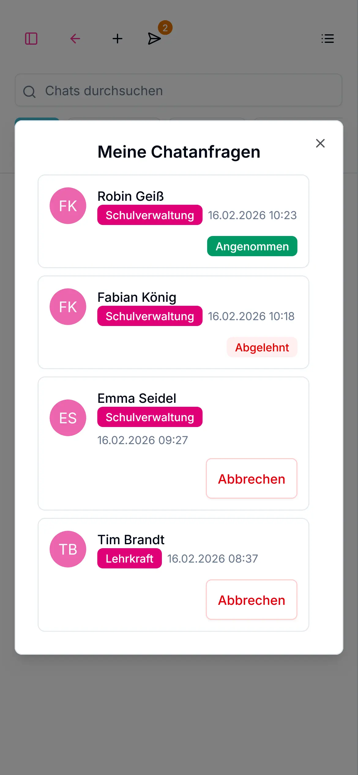 Hier sehen Sie den Status aller Chat-Anfragen, die Sie gestellt haben und können diese bei Bedarf zurückziehen.