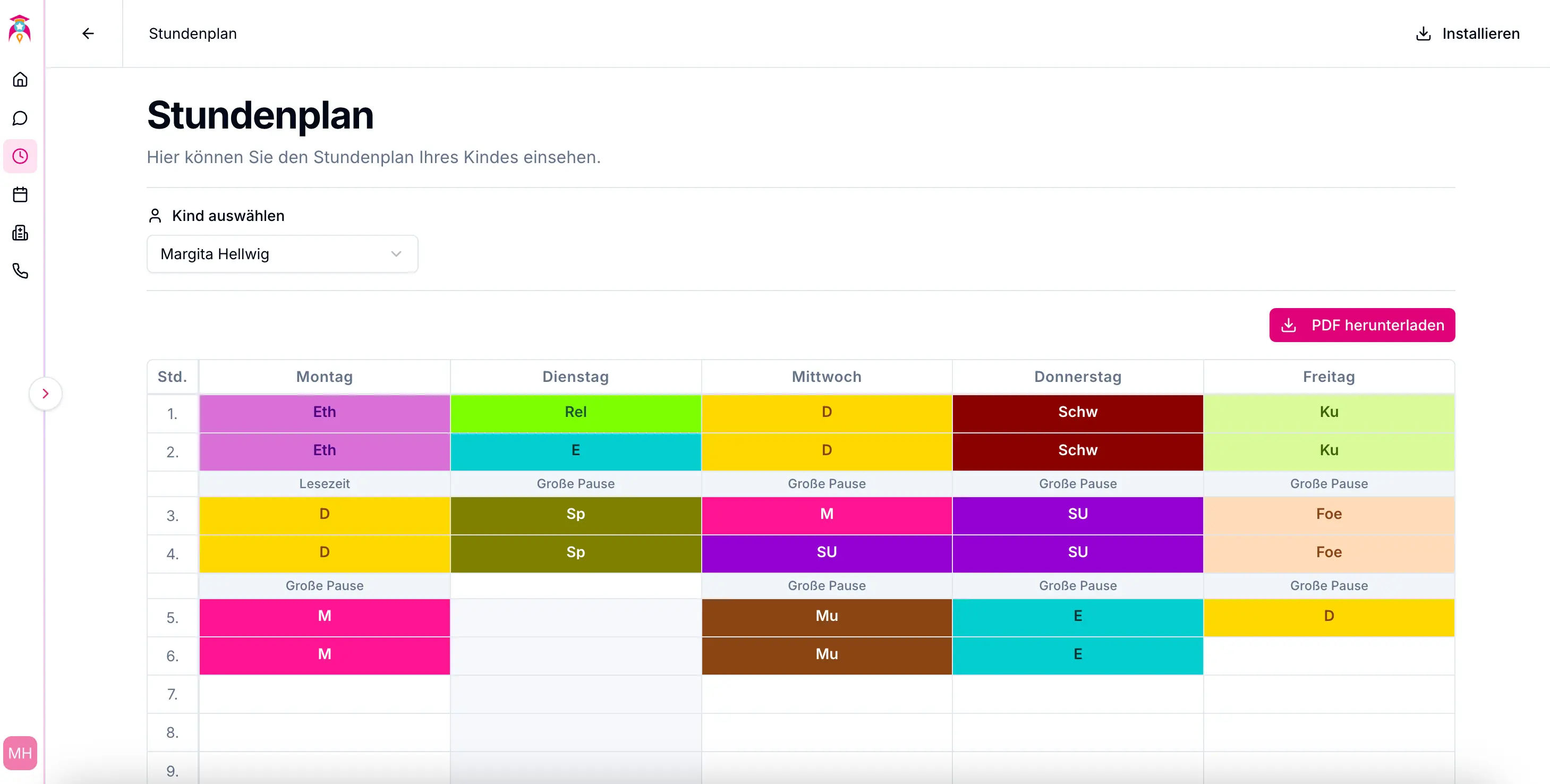 Im Stundenplan werden die Fächer Ihres Kindes angezeigt, sofern diese von der Schule hinterlegt wurden.