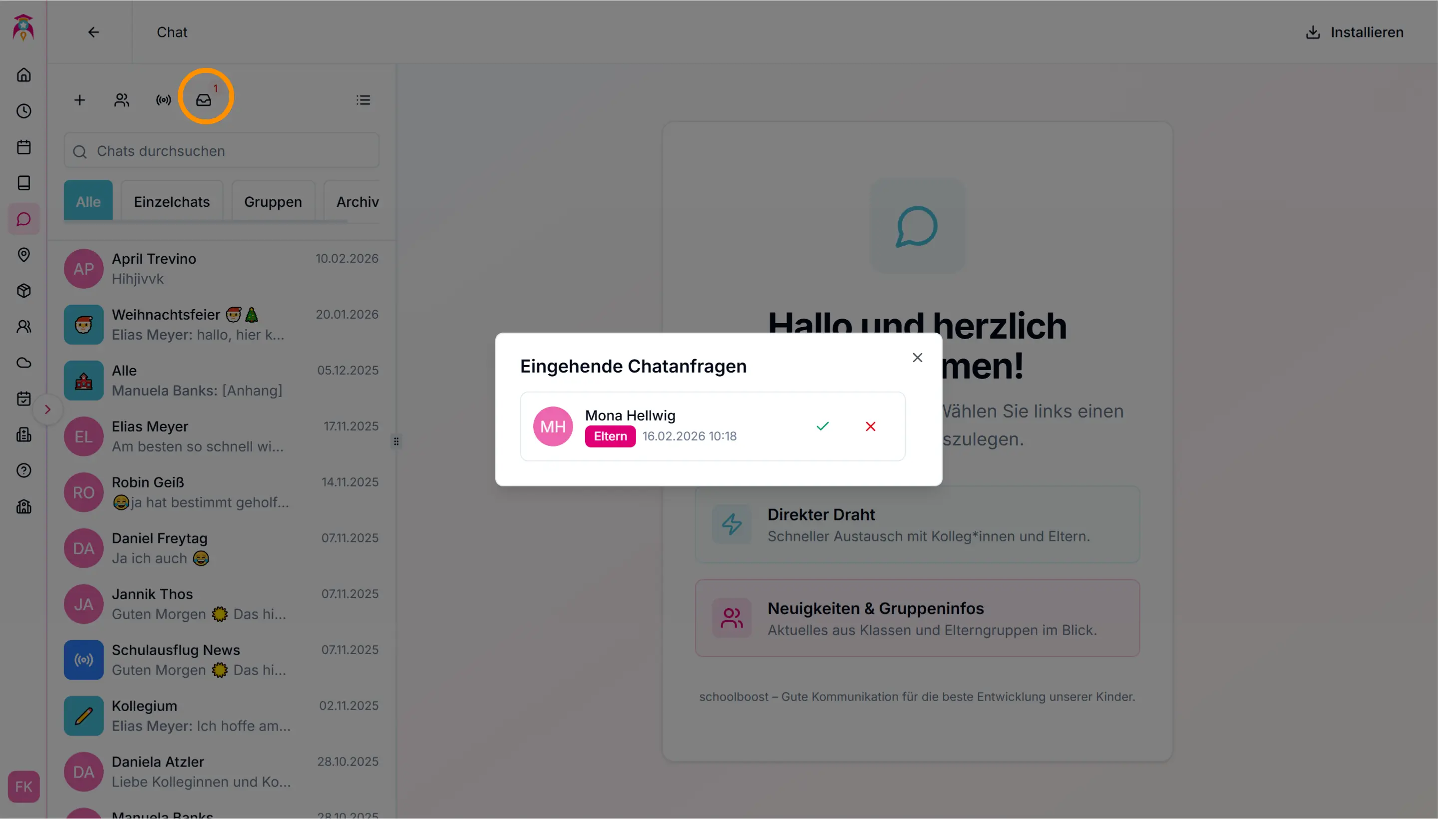 Hier können Sie die Chat-Anfragen von Eltern annehmen oder ablehnen.
