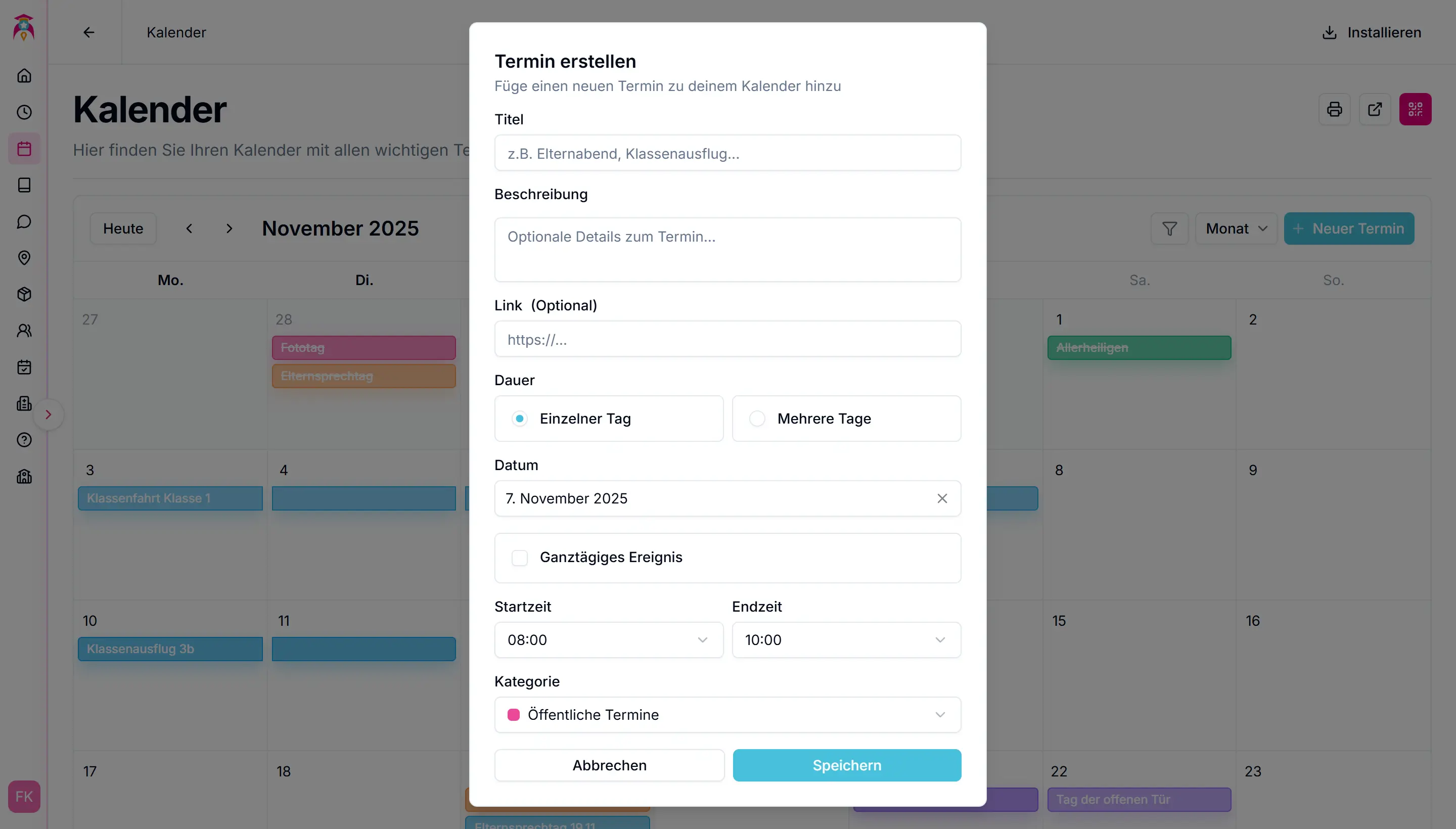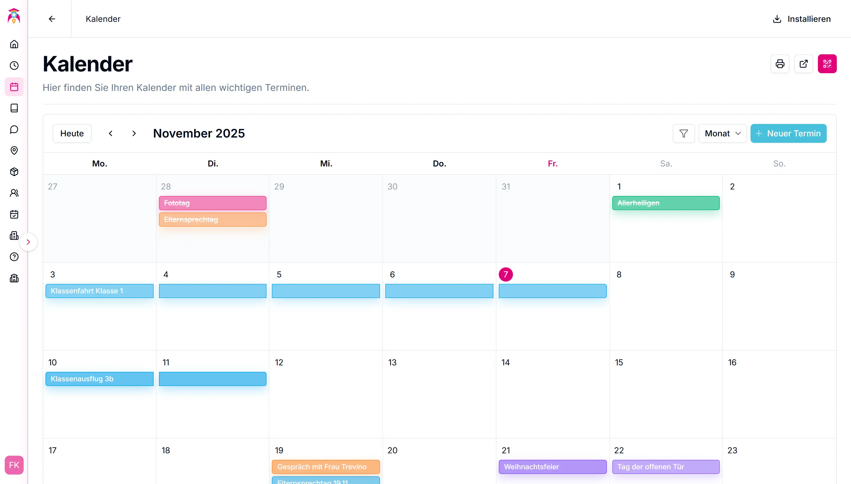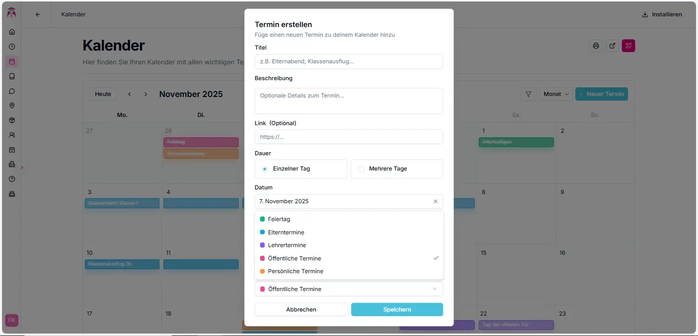 Der Kalender bündelt alle Termine an einem Ort – von persönlichen Erinnerungen bis zu schulweiten Ereignissen. Behalten Sie stets den Überblick über Unterricht, Konferenzen, Feiertage und mehr.