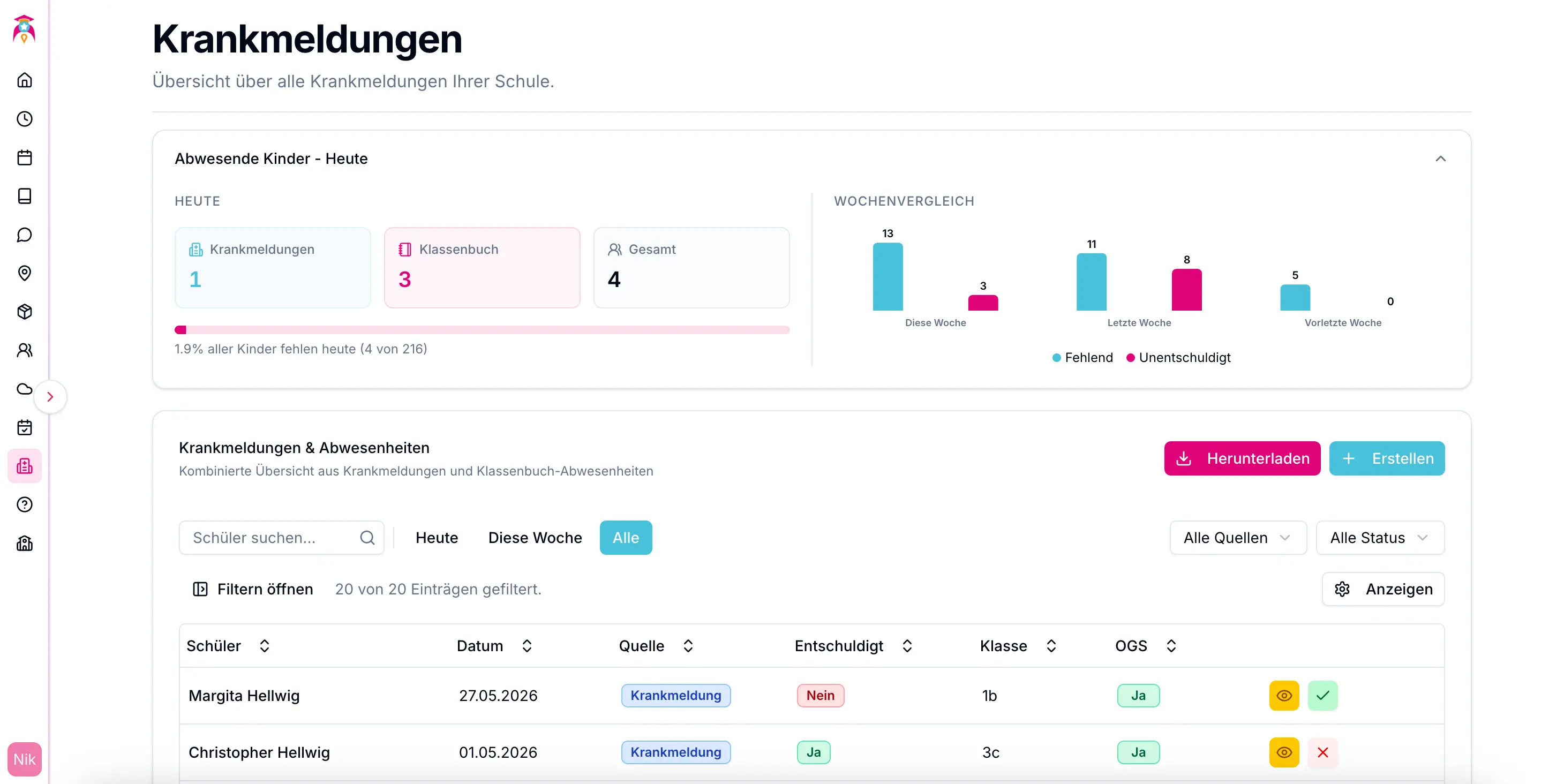- Filtern Sie nach Name, Datum, Quelle, Entschuldigt, Klasse und OGS