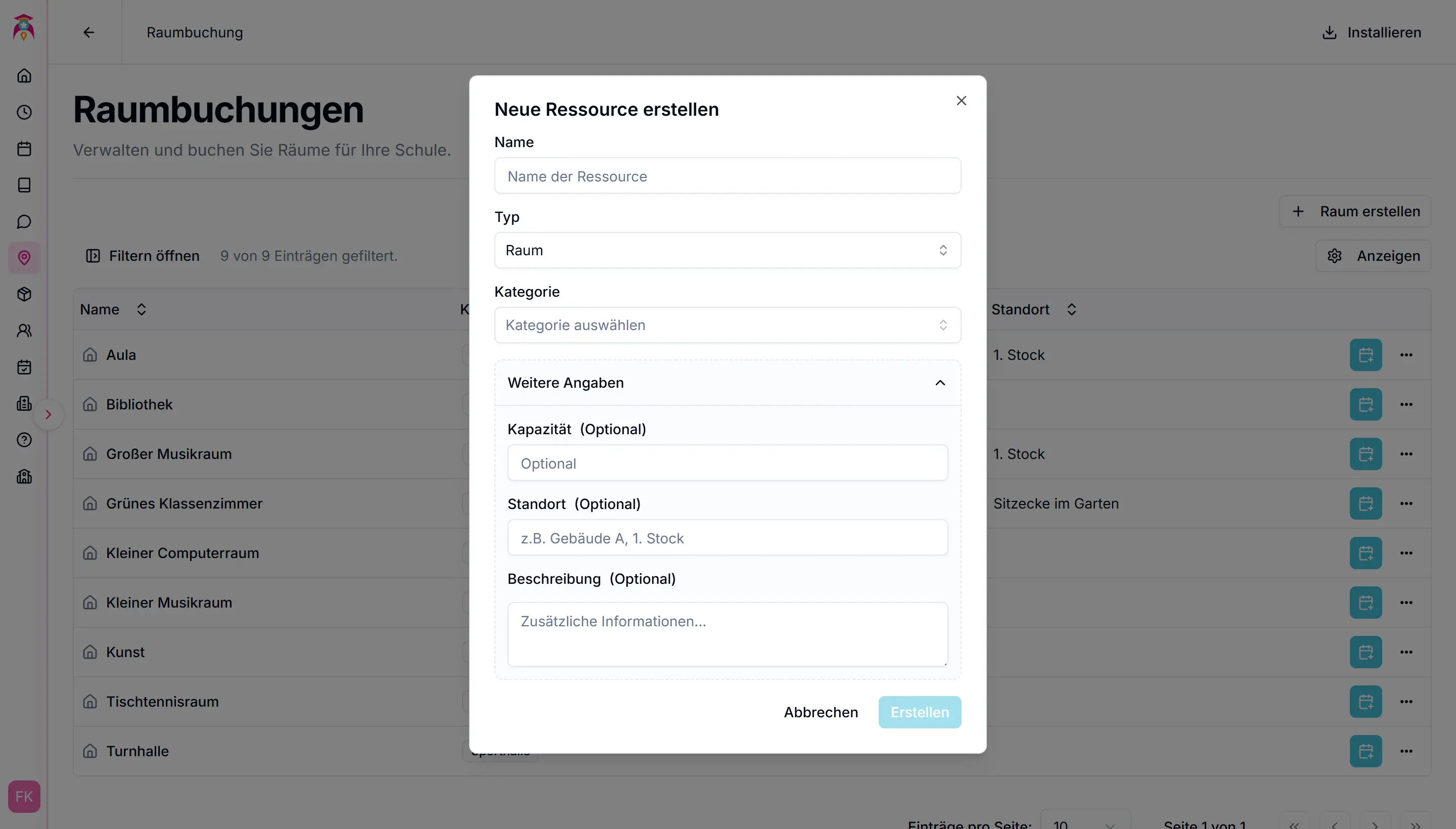- Kategorie (Aula, Bibliothek, Computerraum, Klassenzimmer, Labor, Musikraum oder Sporthalle)