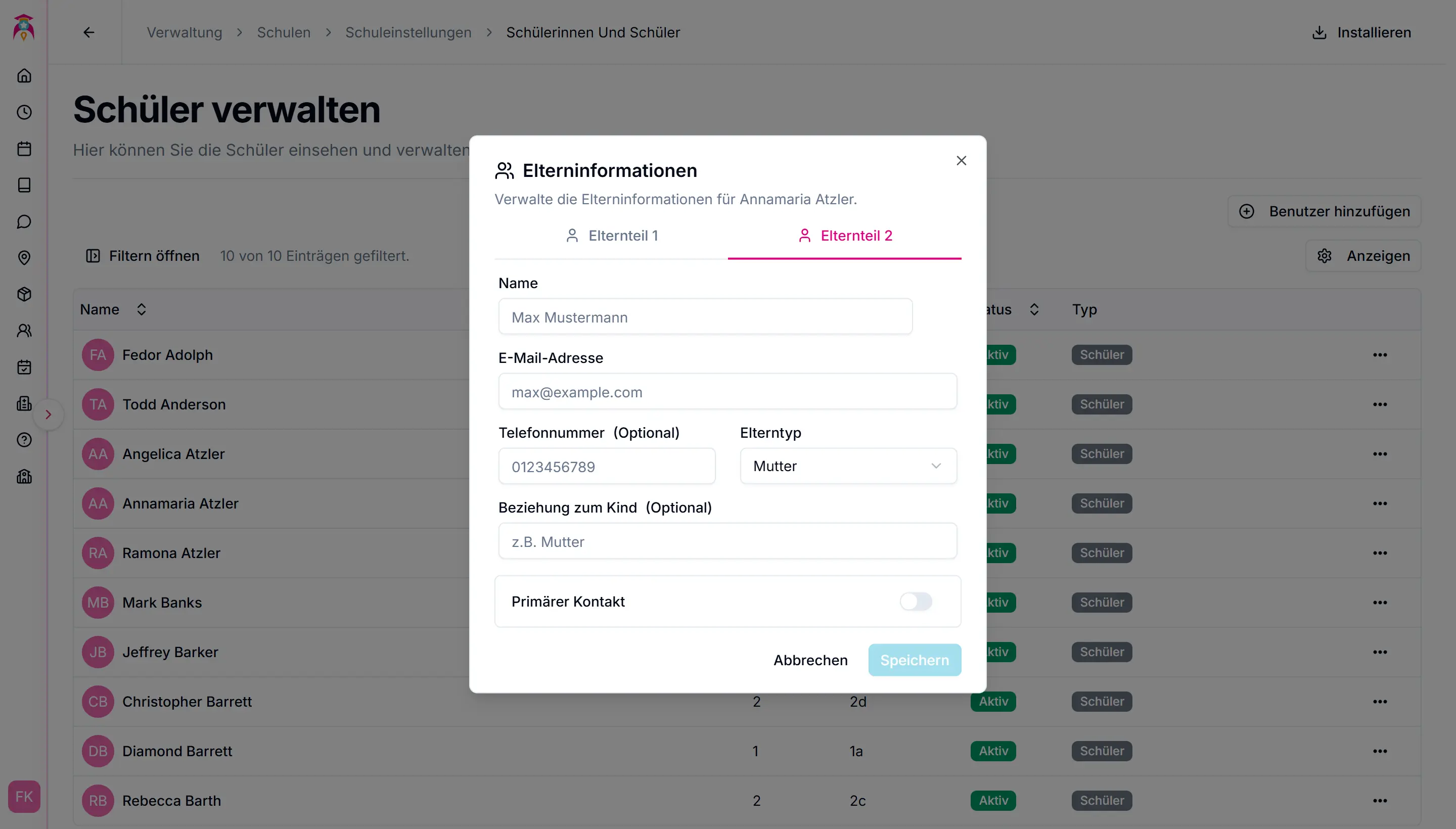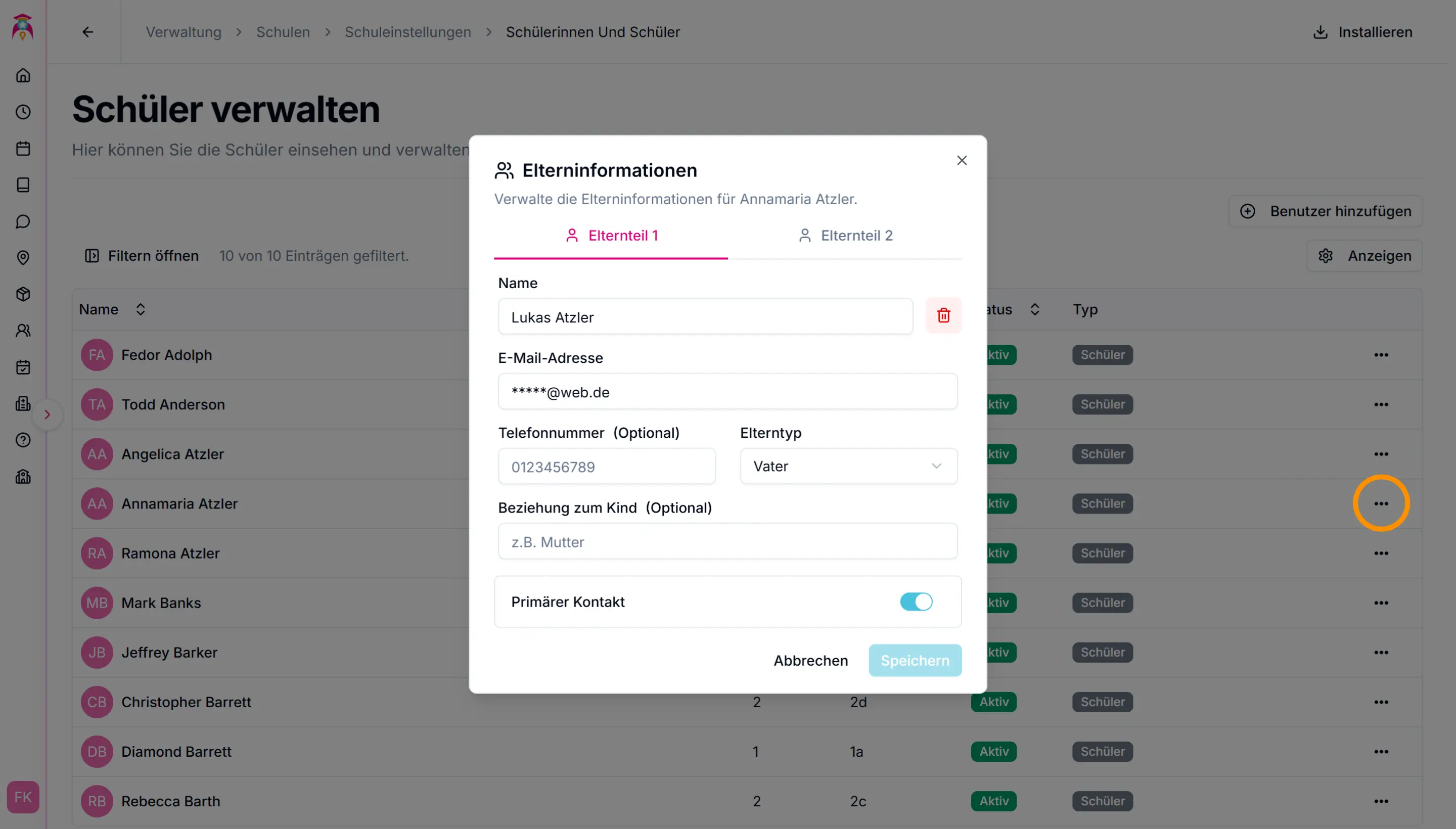 In diesem Abschnitt geht es um das Bearbeiten bestehender Elternaccounts – beispielsweise das Aktualisieren von Kontaktdaten oder das Hinzufügen eines zweiten Elternteils.