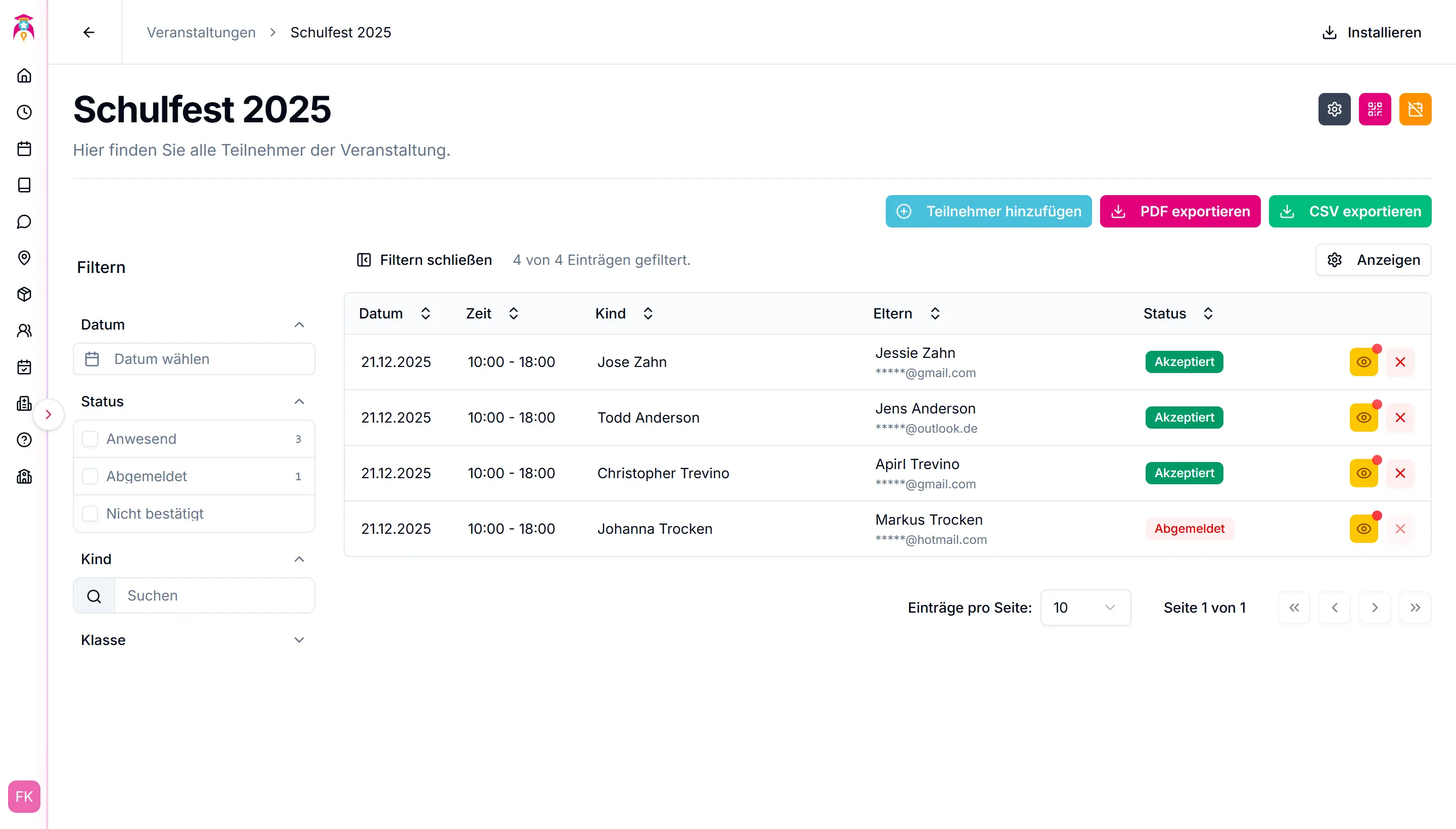 Teilnehmer manuell hinzufügen, die gesamte Liste als PDF oder CSV exportieren und die tabellarische Ansicht anpassen.