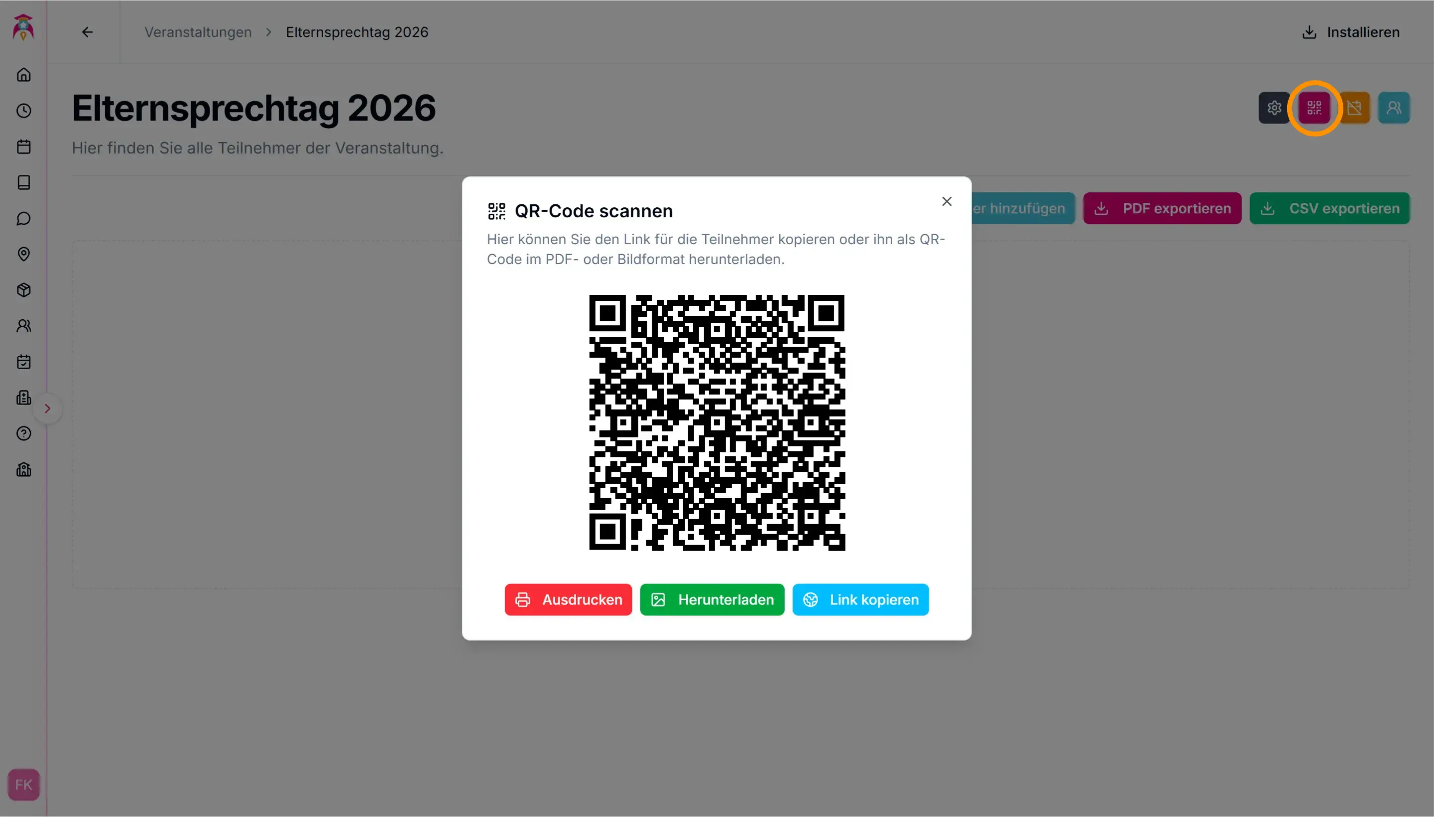 Klicken Sie auf PDF exportieren, um automatisch eine PDF-Datei mit der aktuellen Teilnehmerliste zu erstellen und herunterzuladen.