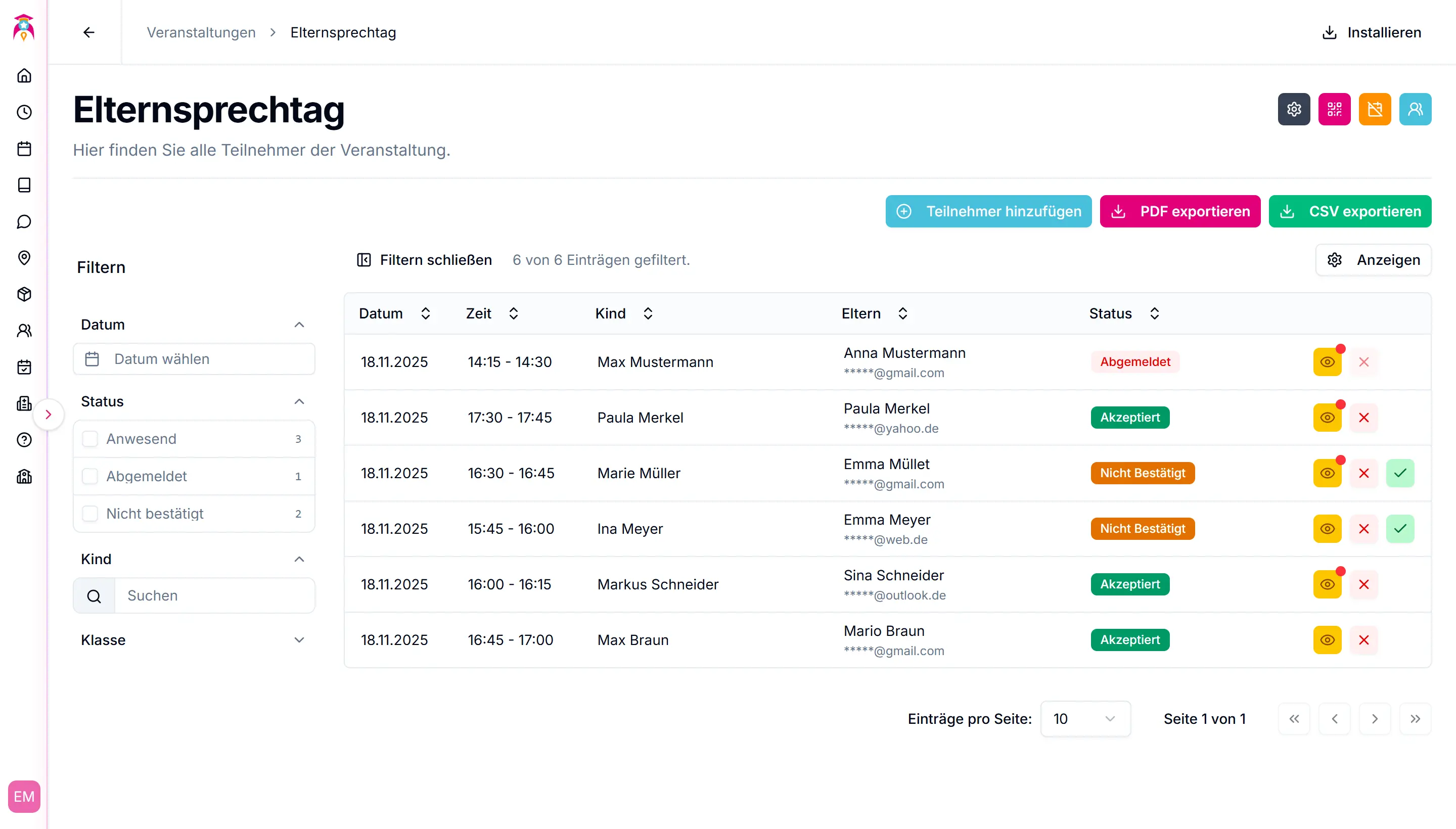 Teilnehmer manuell hinzufügen, die gesamte Liste als PDF oder CSV exportieren und die tabellarische Ansicht anpassen.